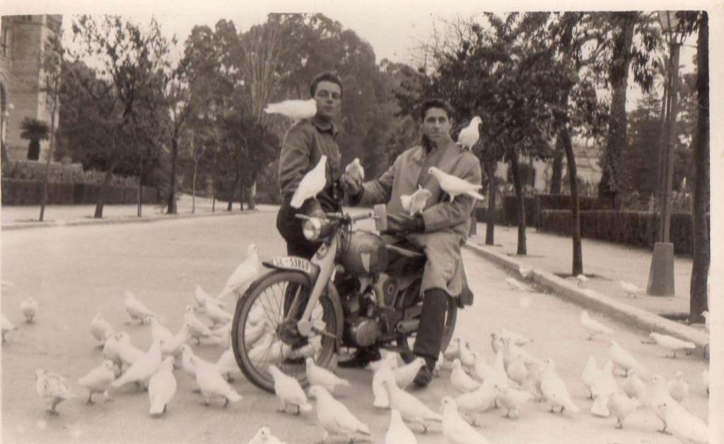 Pulsa en la imagen para agrandar | Nombre participante: Antonia González Cabrera A�o de la imagen: 1965 Personas en la imagen: Mi padre, fotógrafo del parque, y su compañero Agustín. Comentarios: Mi padre dándole de comer a la paloma. Se pone la comida en su boca y la paloma coge su alimento. ¡¡¡ Puede haber mayor compenetración entre paloma y persona.....!!!