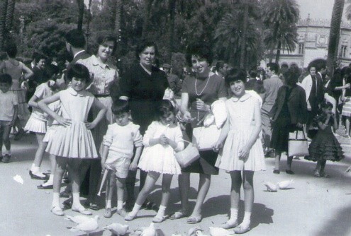 Pulsa en la imagen para agrandar | Nombre participante: José Torres Granell A�o de la imagen: 1960 Personas en la imagen: beatriz y sus hijos Pepa y Carmen( arriba) y Manuela ,Pepe,Ana Mari y Charo (abajo) Comentarios: en una mañana de feria de abril era muy clasico pasear por el ferial, la plaza de España y la Plaza de America