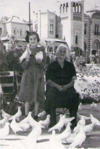 Pulsa en la imagen para agrandar | Nombre participante: José Torres Granell A�o de la imagen: 1952 Personas en la imagen: Angeles Lopez Hernandez y su nieta Angelita Comentarios: Angeles Lopez Hernandez descansa sentada en una de las sillas de hierro que habia en la Plaza de America, junto a su nieta Angelita