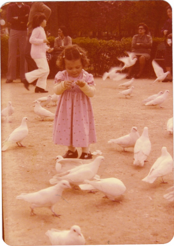esa soy yo con dos añitos dandole de comer a las palomas.