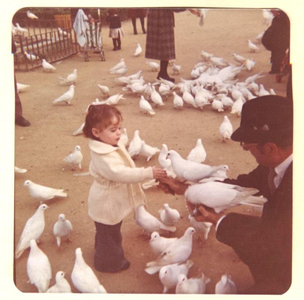 Pulsa en la imagen para agrandar | Nombre participante: Cristina Gala Jiménez A�o de la imagen: 1977 Personas en la imagen: Cristina Gala Jiménez y Antonio Jiménez Salvatierra Comentarios: Cristina con su abuelito, enseñándole a dar de comer a las palomas en la mano.