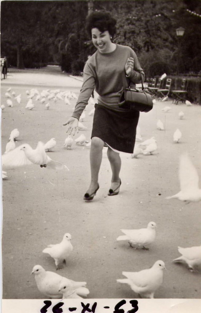 Mi madre feliz persiguiendo a las palomas.