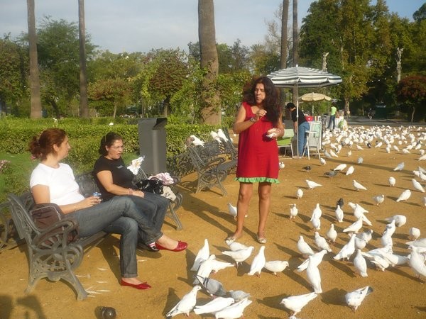 Pulsa en la imagen para agrandar | Nombre participante: ángela Oliva Ramos A�o de la imagen: 2009 Personas en la imagen: ángela oliva, raquel suarez y dolores. Comentarios: esta foto, está hecha el 9 ó 10 de octubre de 2009, entonces yo trabajaba en el pabellón de brasil (u. SE) y algunos días, iba con mis compis, a desayunar al parque de las palomas.