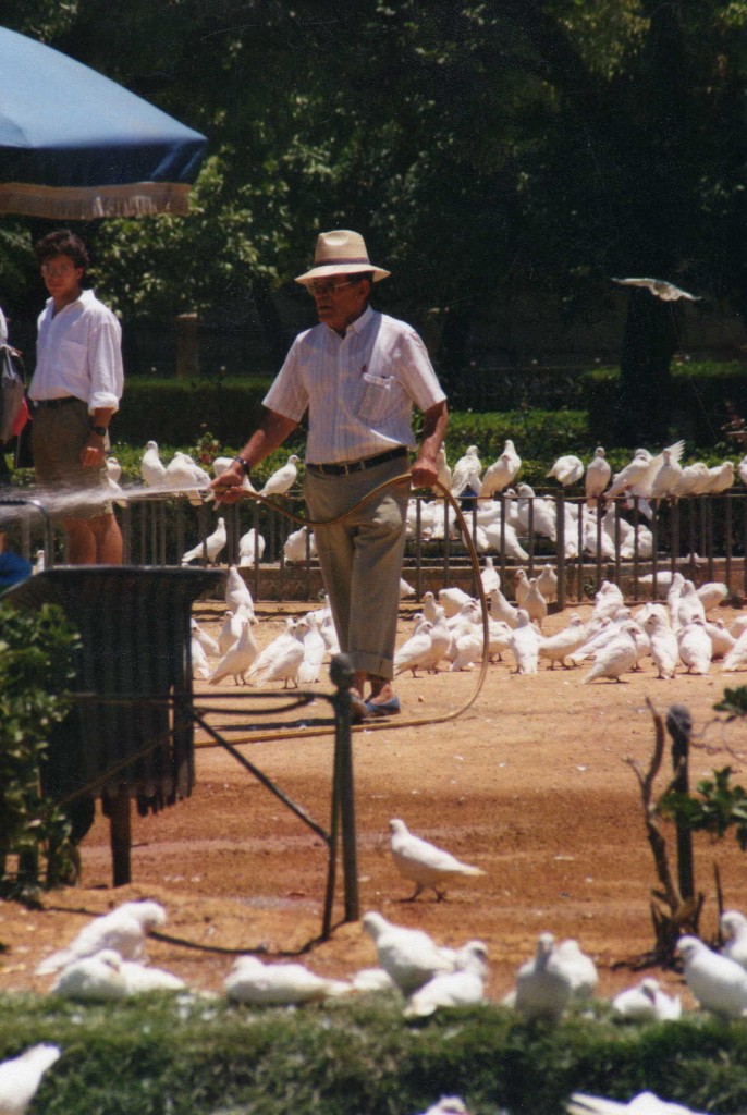 Pulsa en la imagen para agrandar | Nombre participante: Antonia González Cabrera A�o de la imagen: 1987 Personas en la imagen: Mi padre, antiguo fotógrafo del parque de las palomas. Comentarios: Mi padre acompañaba a mi madre, cuando ella aún era arvejonera. Llega la hora de refrescar el ambiente, el calor del día hace estragos....