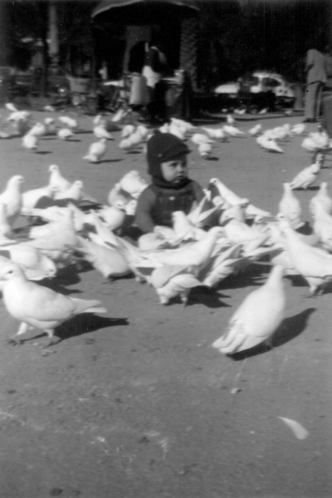 Yo, rodeado de palomas con menos de un año