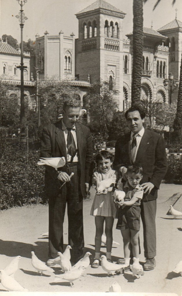 Pulsa en la imagen para agrandar | Nombre participante: Rafael Barrero Prera A�o de la imagen: 1957 Personas en la imagen: Mi Padre Diego Barrero Llanes, mitío Manuel Prera García y mis hermanos Mª Jesus y Dieguito Comentarios: Al fondo se ve el pabellon Mudejar, actual museo de arte y costumbres populares