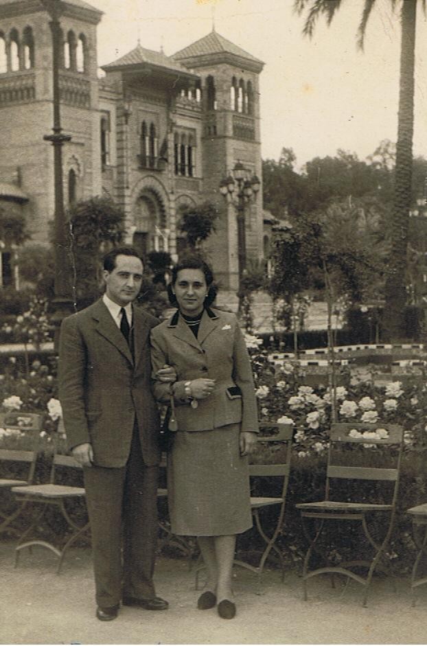 Pulsa en la imagen para agrandar | Nombre participante: Elisa Maldonado Ruiz A�o de la imagen: 1952 Personas en la imagen: Severo Mellado Perez (izquierda) y su mujer Rosa Maria Oliver Costa (Derecha) Comentarios: Visita obligada al Parque de las Palomas durante aquella Feria De Abril de los años 50